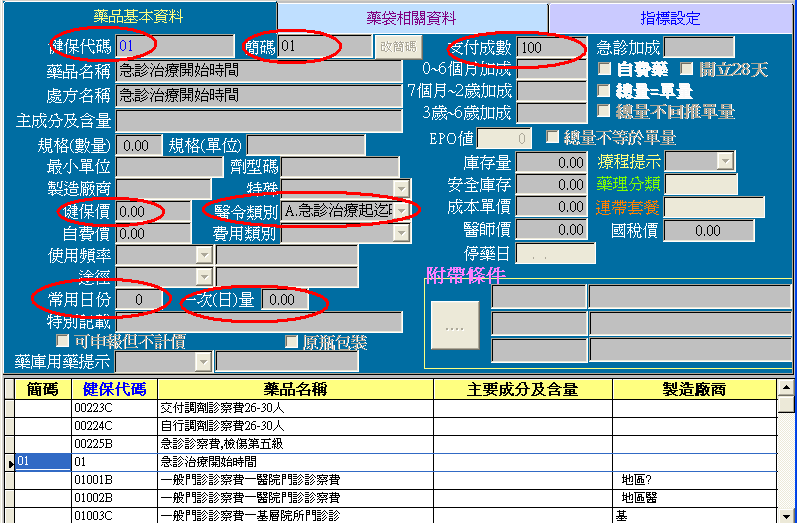 1.F4尋找健保代碼01 / F7修改 ~填上簡碼01 / 健保價 0 / 醫令類別 A / 常用日份及一次