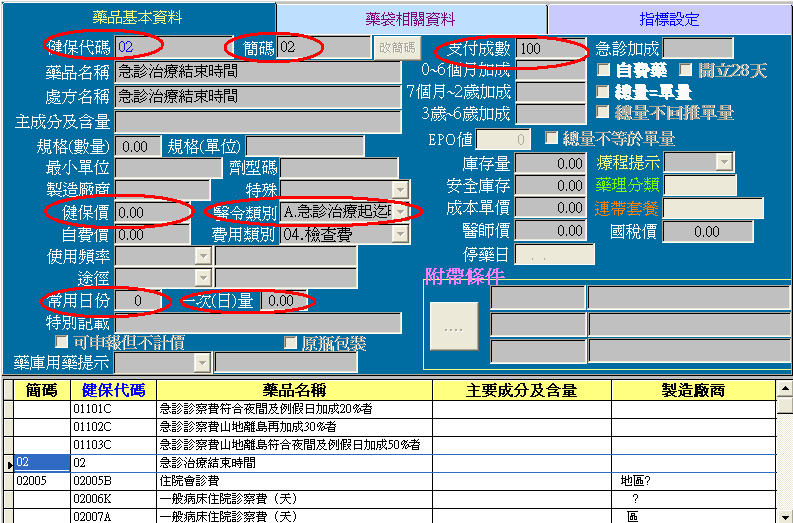 2.F4尋找健保代碼02 / F7修改 ~填上簡碼02 / 健保價 0 / 醫令類別 A / 常用日份及一次