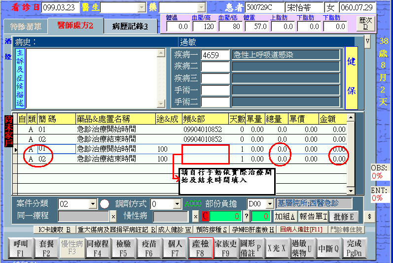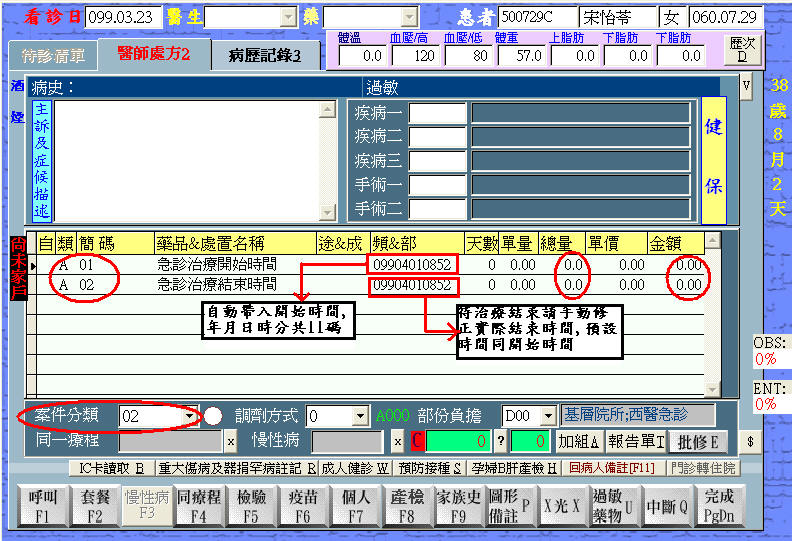 先帶入急診治療開始時間,但02的時間待結束時請自行修改實際結束時
