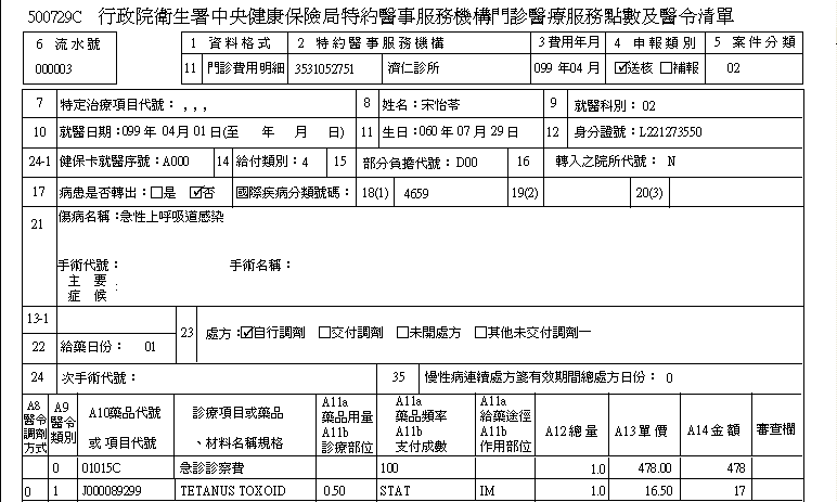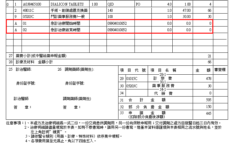 1.申報「案件分類」為「02:西醫急診」案件,須同時填報「醫令類別」之代碼「A:急診治療起迄時間」、「藥品(項目)代號」填寫代碼01(急診治療起始時間)或02(急診治療結束時間)及「藥品使用頻率」對應填入11碼之治療起始或結束時間之民國年(3碼)、月(2碼)、日(2碼)、時(2碼)、分(2碼)。如一保險對象至急診就醫,治療起始之時間為98年12月31日16時52分,治療結束之時間為99年1月1日7時3分,則於「門診醫療服務醫令清單」增加填報兩筆時間資料,「總量」及「點數」必填欄位請申報為0